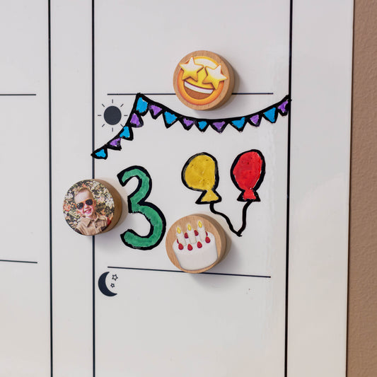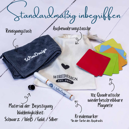 Bringen Sie Farbe auf Ihre Tafeln mit unseren Kreidemarkern. Diese können auf allen unseren Plantafeln verwendet werden und verleihen Ihrer Tafel einen besonders schönen und gemütlichen Look! Sie können auch Ihre eigenen Magnete mit Emojis oder Fotos personalisieren! Superpraktisch für die Kleinen, die noch Probleme mit dem Lesen haben. Mit unserem Stifthalter können Sie Ihre Stifte gut aufbewahren, und unsere Ablage „an der Seite“ ist praktisch, um lose Papiere, Karten, Fotos oder Zeichnungen aufzuhängen.