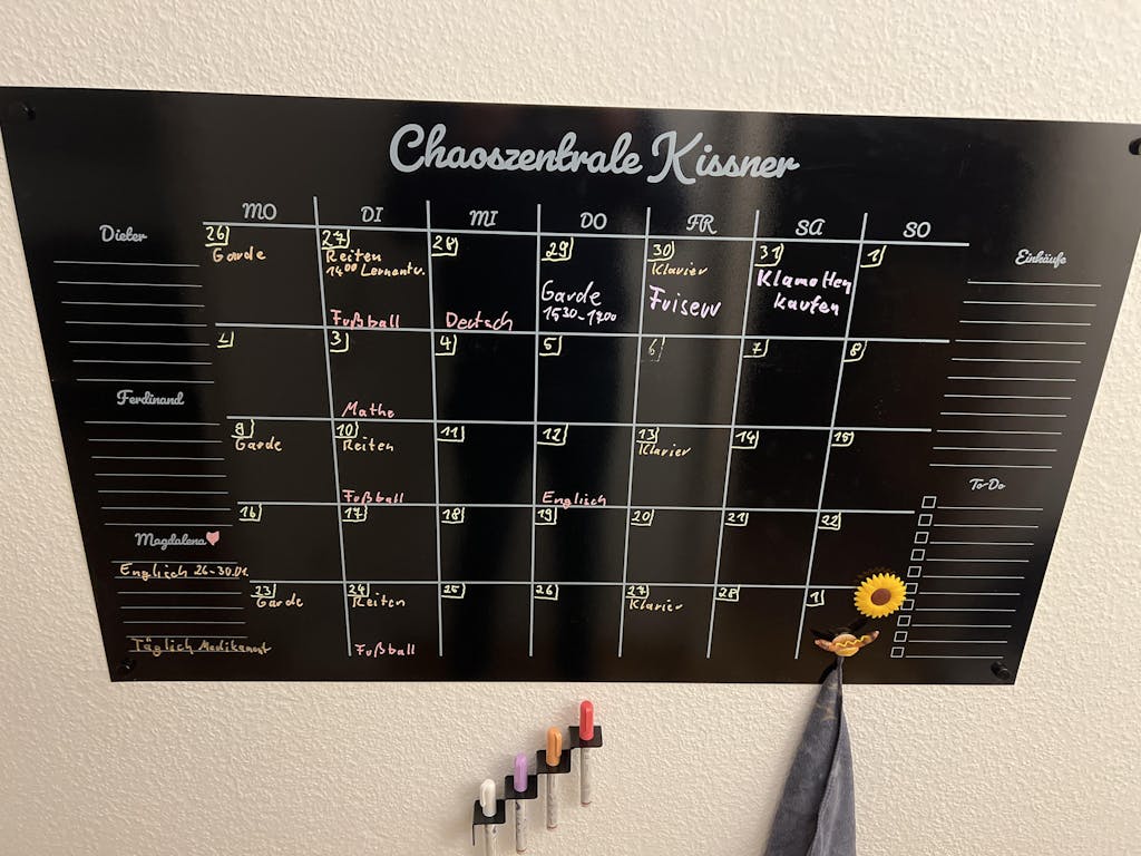 Ich mag den Familienplaner, mit den Kreidestiften lässt sich sehr gut schreiben, man hat einen übersichtlichen Monatsplan, die Qualität ist toll, es lässt sich schnell befestigen und entgegen meiner ersten Befürchtung hält es auch super an der Wand und klappert nicht. Der Stiftehalter ist sehr nützlich, habe ihn unterhalb des Boards angebracht. Die Kids sind auch begeistert. Ein rundum ausgereiftes Produkt.